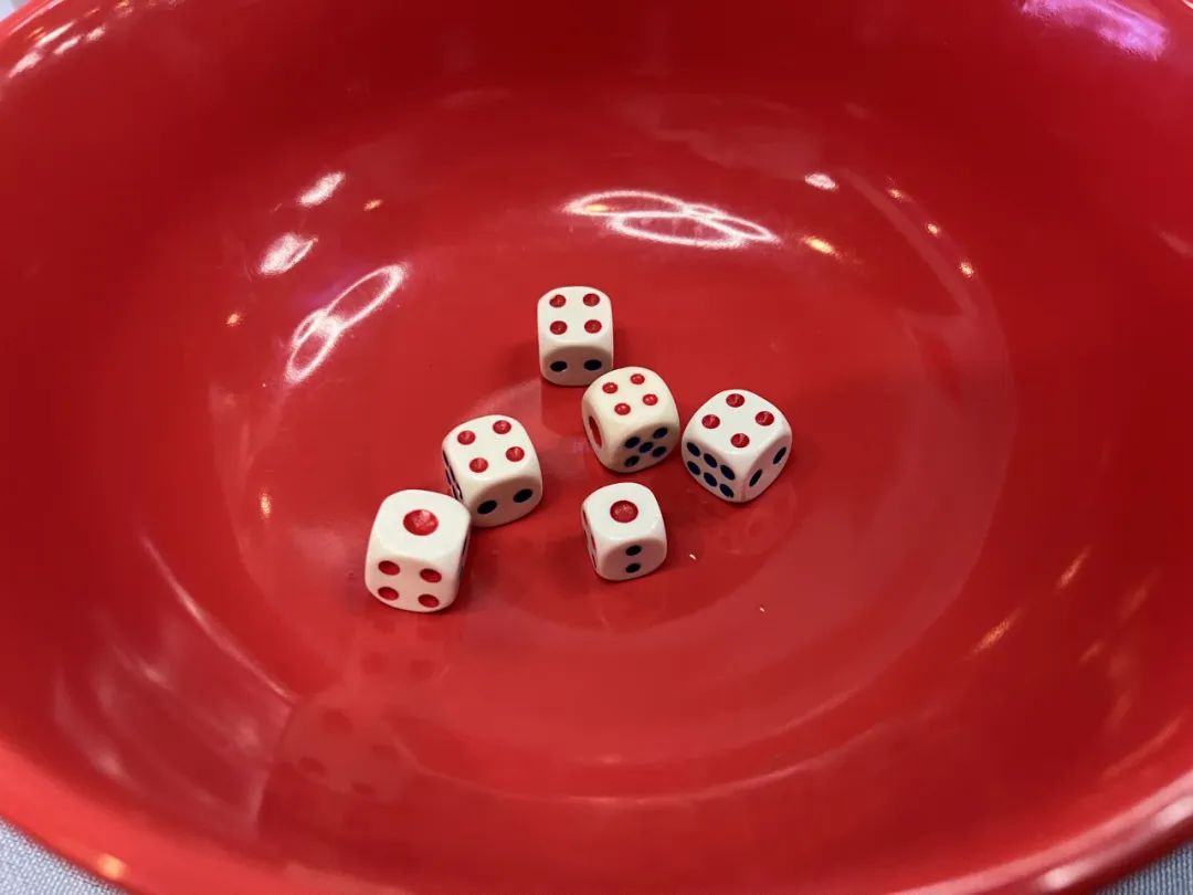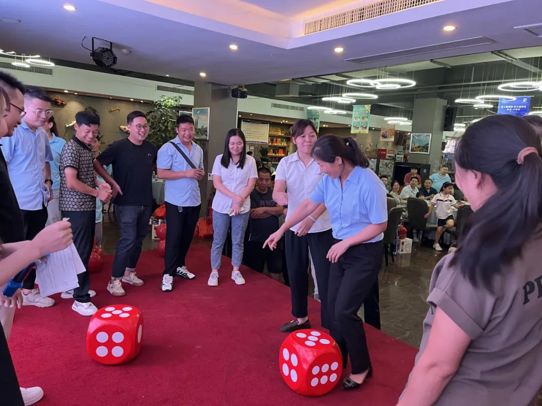 在所有人到齐之后,一桌的人围成一圈,欢乐的博饼正式开始。从一秀到状元,随着骰子撞击的清脆声,总会迎来一阵阵的喝彩和欢笑,奖品也随之收入囊中。无论手气好坏,当欢声笑语从每一桌飘出、大家眼底洋溢着快乐时,都实实在在地让每个迎欣人感受到迎欣大家庭的温暖和关爱。